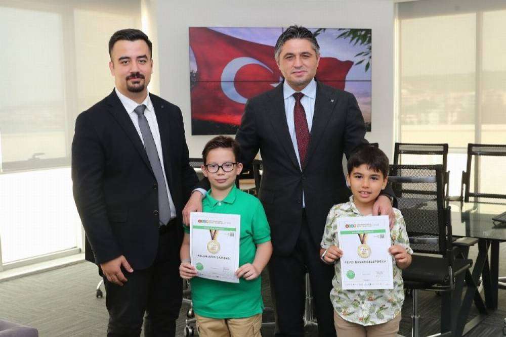 Aliağa Belediye Başkanı Serkan Acar, ‘Uluslararası STEM Olimpiyatları’nda kodlama kategorisinde 3.sınıflar düzeyinde dünya birincisi olan Aslan Ateş Sarıbaş ile 2.sınıflar düzeyinde dünya üçüncüsü olan Fevzi Başar Celepoğlu’nu makamında misafir etti.