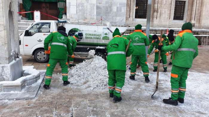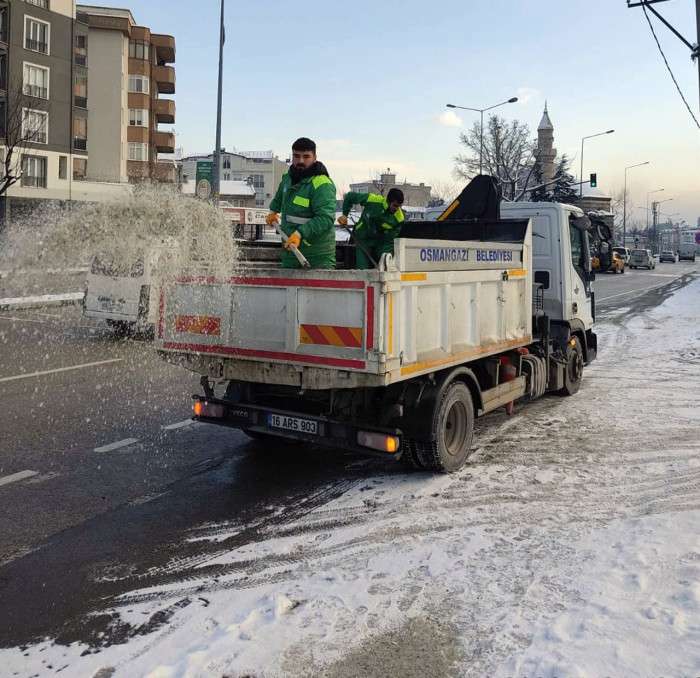 Osmangazi Belediyesi karla mücadele ekipleri, ayrıca şehir merkezindeki cadde ve kaldırımlar başta olmak üzere meydan, park, cami, yaya geçidi, kamu binaları gibi vatandaşların yoğun olarak kullandığı noktaları da kardan temizleyip, tuzlama çalışması gerçekleştiriyor. Yağışla birlikte yollarda biriken karları temizleyen ekipler, buzlanmaya karşı da solüsyon döküyor.